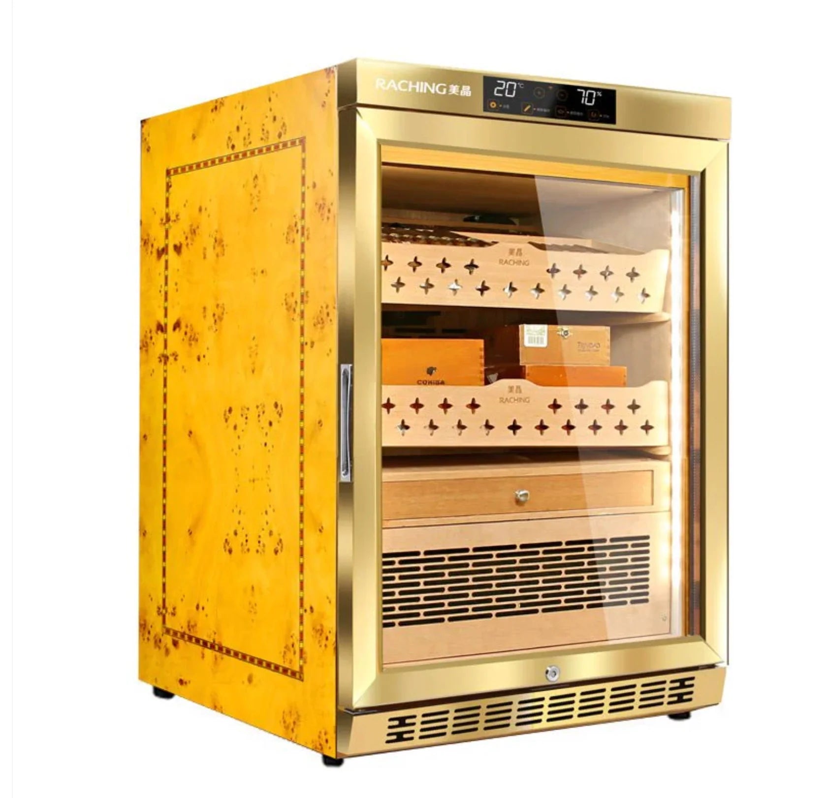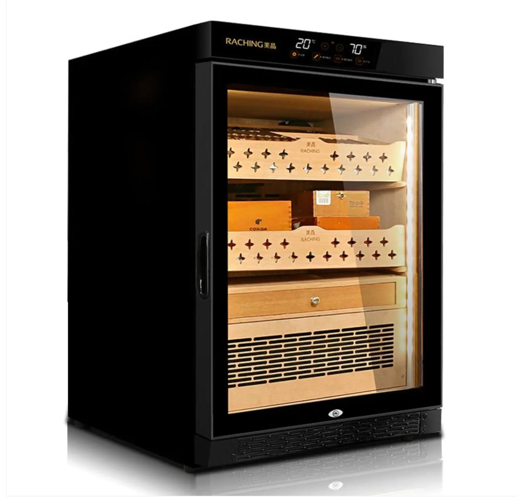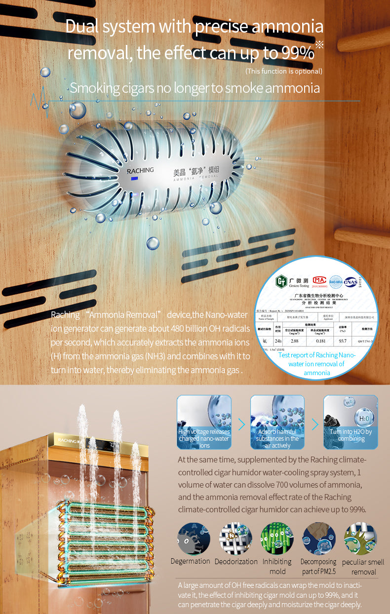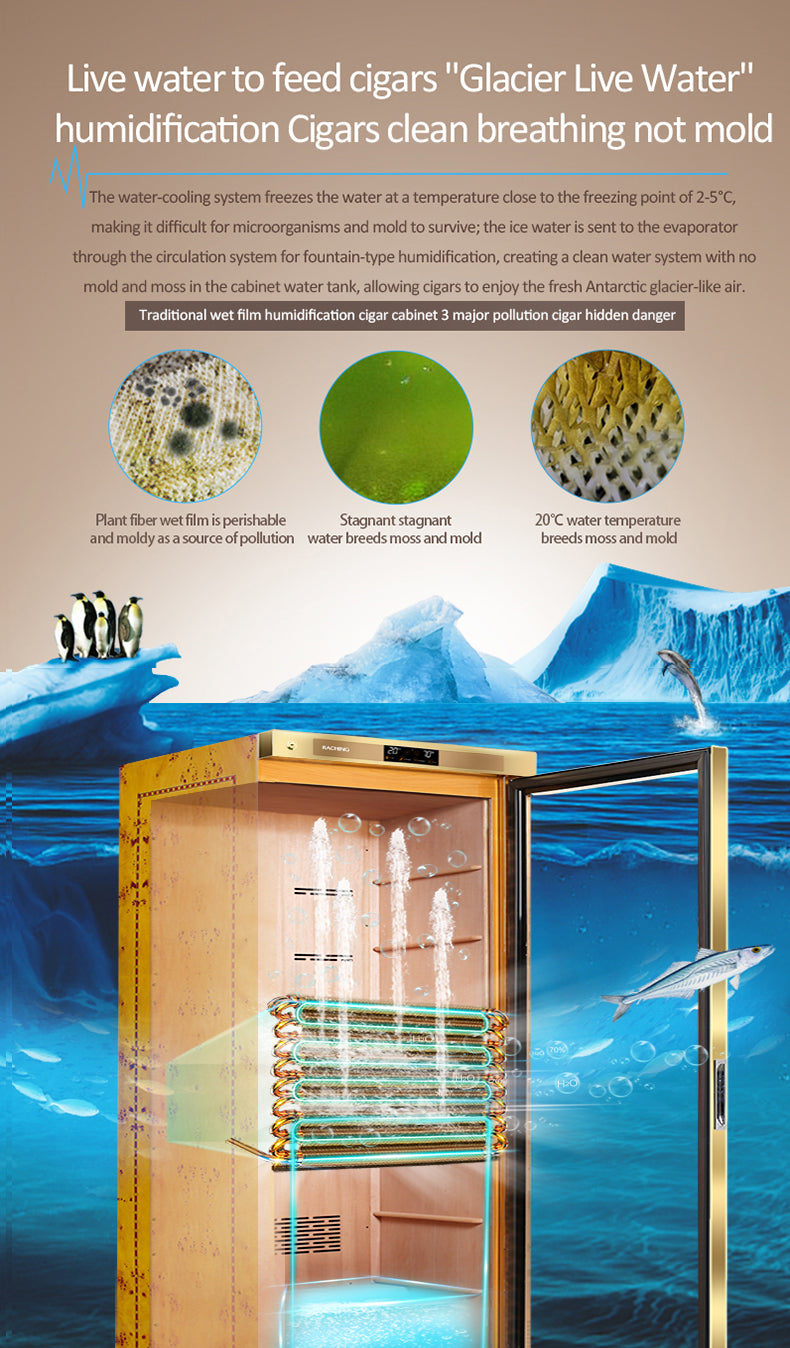 Premium Spanish cedar-lined smart humidor with water-cooling evaporator and precision climate control.