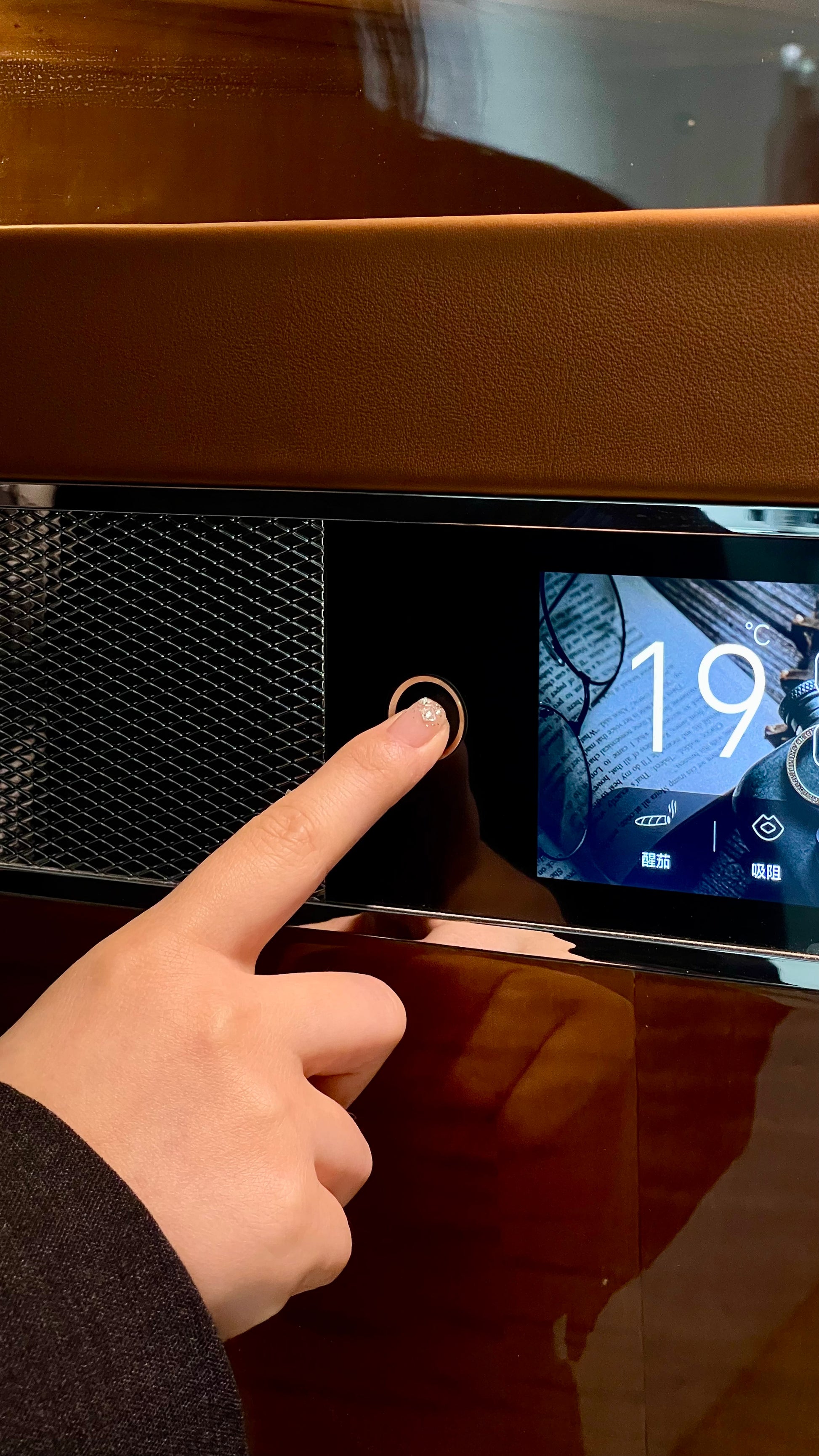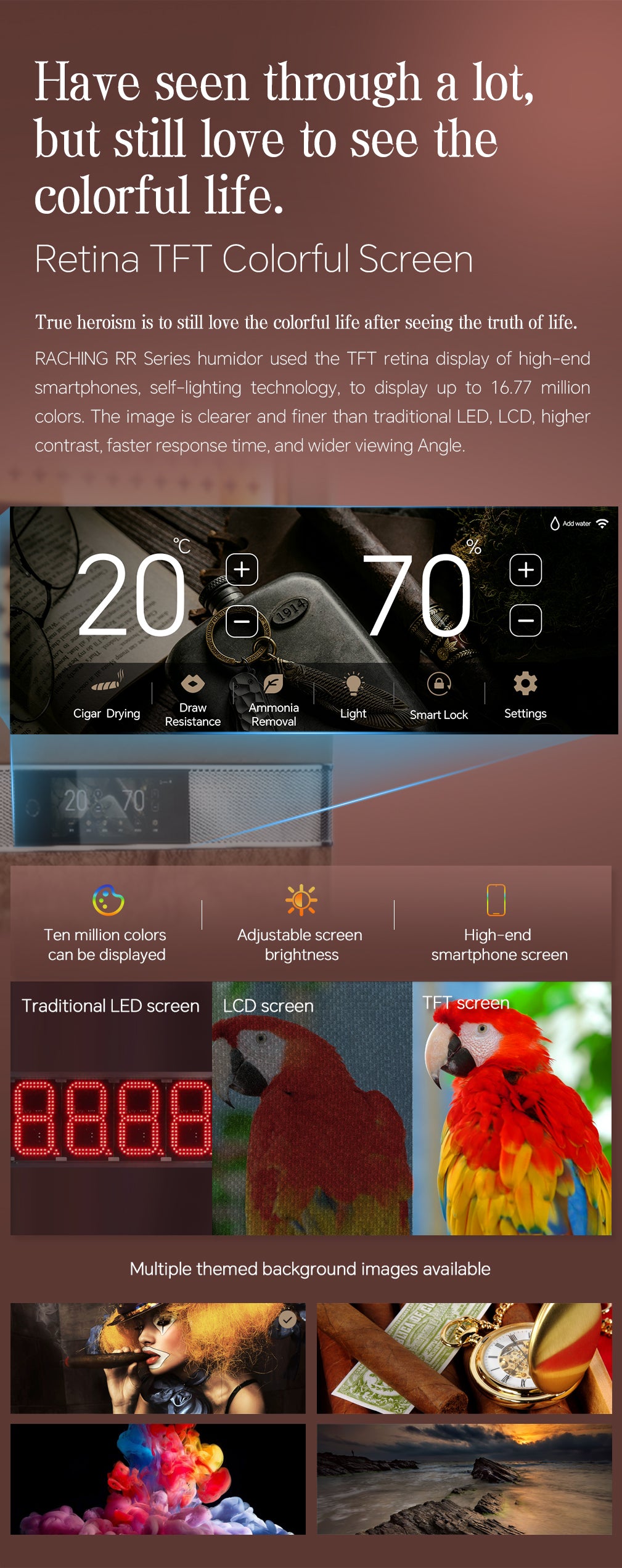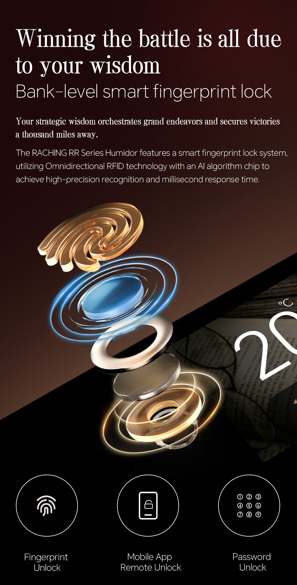 Luxury Spanish cedar-lined humidor with smart fingerprint lock, glacial running water system, and anti-mold technology.